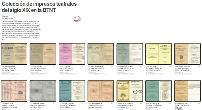 Tablero de Pinterest de la Biblioteca Tomás Navarro Tomás que muestra la Colección de algunos de los impresos teatrales del siglo XIX