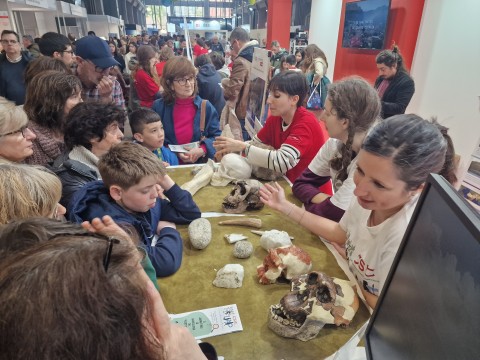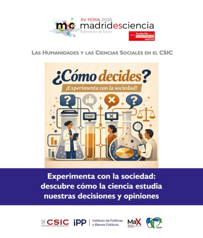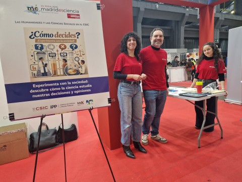 El sábado fue un día concurrido ya que era un día de fin de semana y las familias se animaron a visitar la feria. Por la mañana estuvieron las investigadoras del Laboratorio de Arqueología del Pleistoceno Cristina López, Nekbet Corpas y Elisa Traver con la actividad: La Investigación en los Laboratorios de Arqueología de I+D. En esta actividad mostraron con un variado número de materiales, incluyendo varias reproducciones de calaveras humanas de distintas épocas, lo que se hace en las distintas excavaciones en las que trabajan por todo el mundo. Ya por la tarde, tuvimos la suerte de tener personal de las Ciencias Sociales del Instituto de Políticas Públicas con la actividad: Experimenta con la sociedad: descubre cómo la ciencia estudia nuestras decisiones y opiniones. Los asistentes fueron: Luis Miller, Amalia Álvarez-Benjumea y Eva Fernández.  Su actividad invitó a descubrir cómo las ciencias sociales estudian la forma en que pensamos, opinamos y tomamos decisiones en la vida cotidiana. A través de pequeños experimentos y dinámicas participativas inspiradas en investigaciones reales, las personas asistentes podrán ponerse en la piel de quienes participan en estudios científicos y comprobar cómo se analizan nuestras opiniones y comportamientos. Durante la actividad, se exploró, de manera sencilla y divertida, cómo se diseñan los experimentos en ciencias sociales y qué tipo de preguntas ayudan a responder: desde cómo tomamos decisiones hasta cómo se forman nuestras opiniones. Una oportunidad para experimentar en primera persona cómo la ciencia investiga la conducta social.