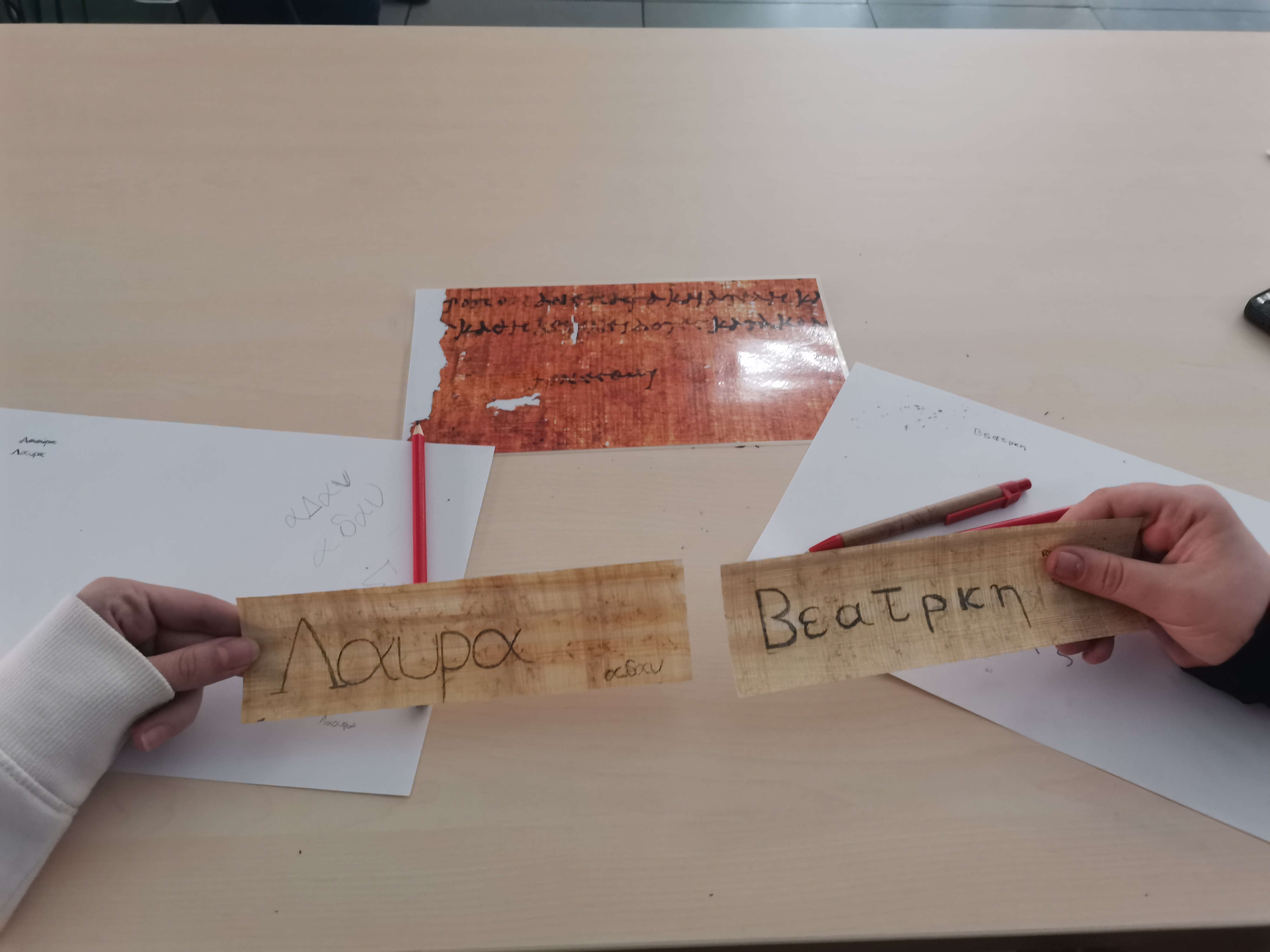 Despues asistieron al taller Mujeres en papiro. Escribas, maestras y poetisas en la Antigüedad impartido por las investigadoras María Jesús Albarrán Martínez y Leia Jiménez Torres (ILC, CSIC). El taller consistió en varias actividades, en primer lugar se les ofreció una interesante charla sobre el papel de las mujeres en la escritura y la comunicación de las mujeres en los papiros, despues tuvieron una prueba de contenidos sobre lo que se había hablado en el formato de juego Kahoot durante la cual hubo emoción hasta el final ya que las profesoras apostaban fuerte. Finalmente ganarona las alumnas a las que se les premió con merchandaising del CSIC. La segunda parte del taller consistió en la escritura en papiros para convertirlos en marcapáginas. Se les repartieron papiros a cada asistente, y tambien poeisías escritas en griego. Pudieron elegir entre copiar algún verso o escribir sus nombres en letras griegas. La experiencia fué muy entretenida y surgieron verdaderas obras de arte.