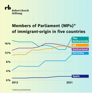 Como parte de esta iniciativa, el informe REPCHANCE Europe compara cinco países (Alemania, España, Países Bajos, Reino Unido y Suiza) y revela que la representación parlamentaria de personas de origen inmigrante sigue siendo baja en varias democracias europeas: Países Bajos lidera con un 19% de diputados de origen inmigrante, mientras que España ocupa el último lugar con solo un 2%. Alemania ha experimentado el mayor crecimiento en la última década (+7 puntos porcentuales), aunque la representación sigue estancada tras las elecciones de 2025 (11,6%).